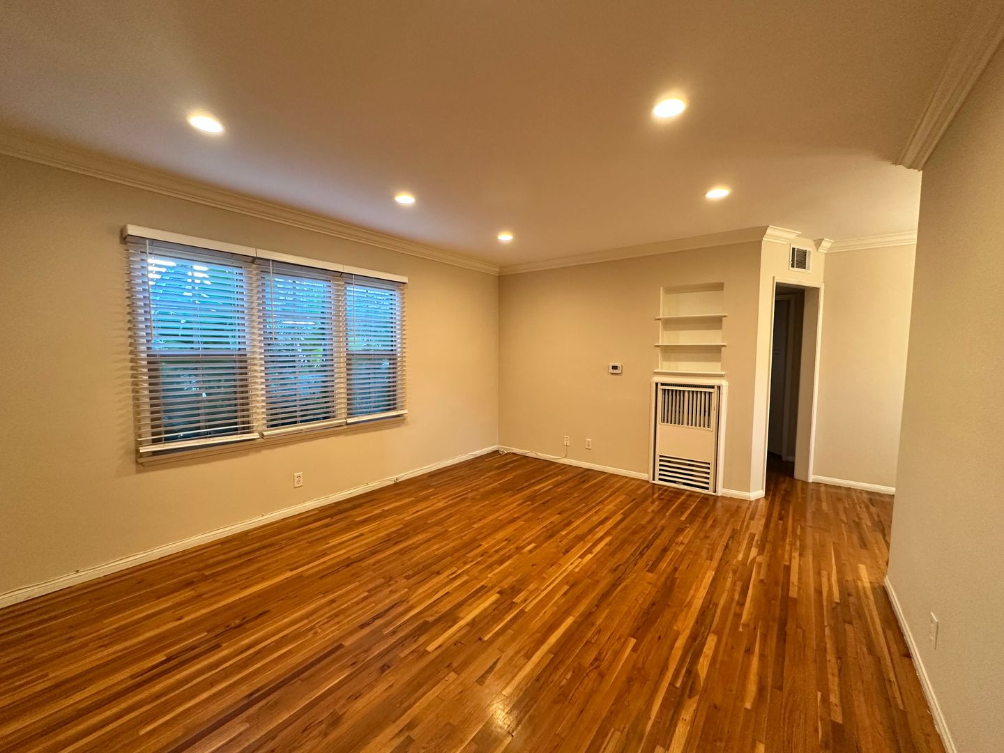 This bright and quiet bottom floor unit that features REAL hardwood floors in living room & bedroom , and modern tile flooring in kitchen and bathroom. The unit has multiple LED recessed lighting fixtures, beautiful crown moldings, new high-end dual-glazed windows throughout featuring low-E3 energy efficiency. Kitchen features GRANITE countertops and is equipped with Stainless Steel microwave, stove/oven, and a dishwasher. The unit has CENTRAL A/C and heat, smooth ceilings, and a designated covered parking space. The unit features a back door from the kitchen to a beautiful shared balcony.