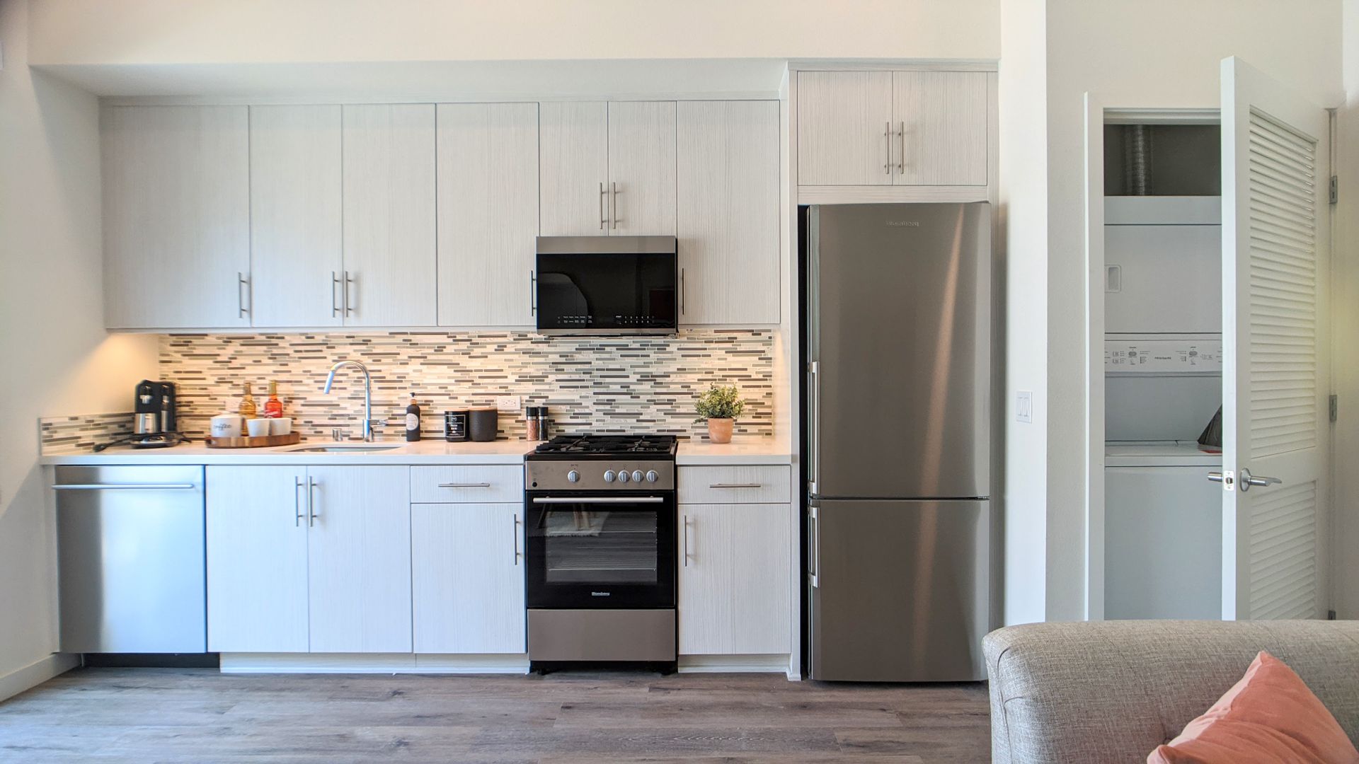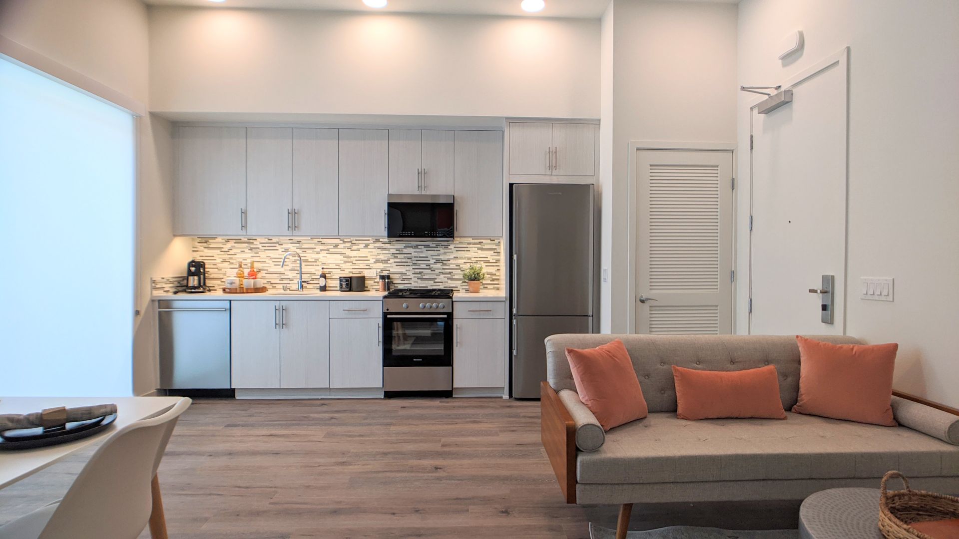 FEATURING the latest and greatest in apartment living tech: everything from electronic Bluetooth door locks to Nest thermostats, EV charging stations, a Butterfly MX entry system, and Amazon Hub package lockers. In addition, all units come equipped with stainless steel appliances (including dishwashers and gas ranges), European cabinetry, elegant hardwood vinyl plank flooring, mosaic tile backsplashes, and in-unit washer and dryers!