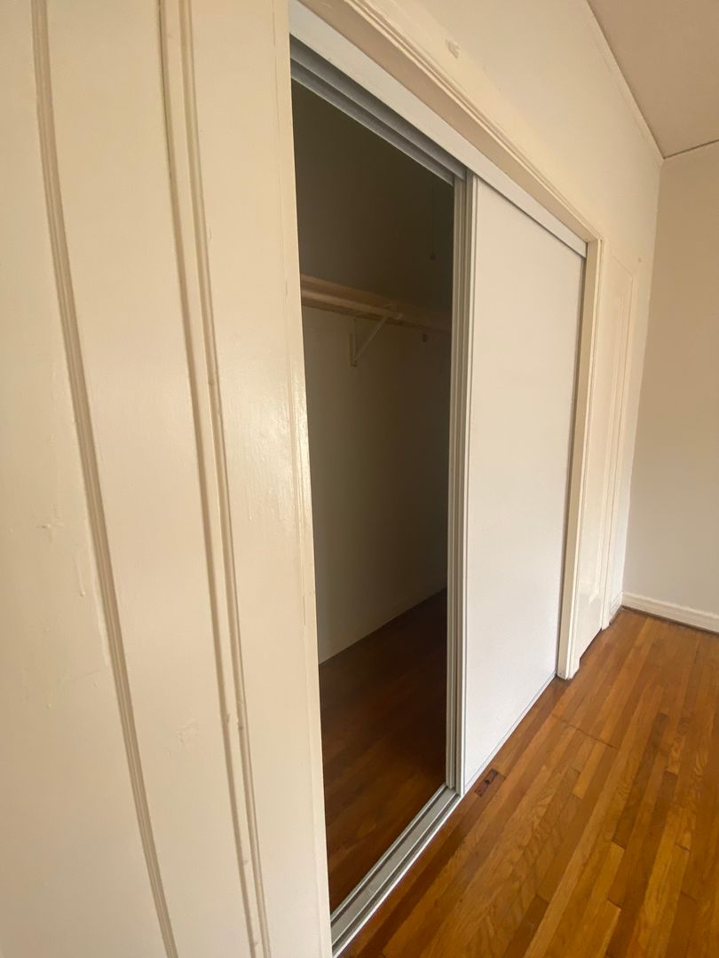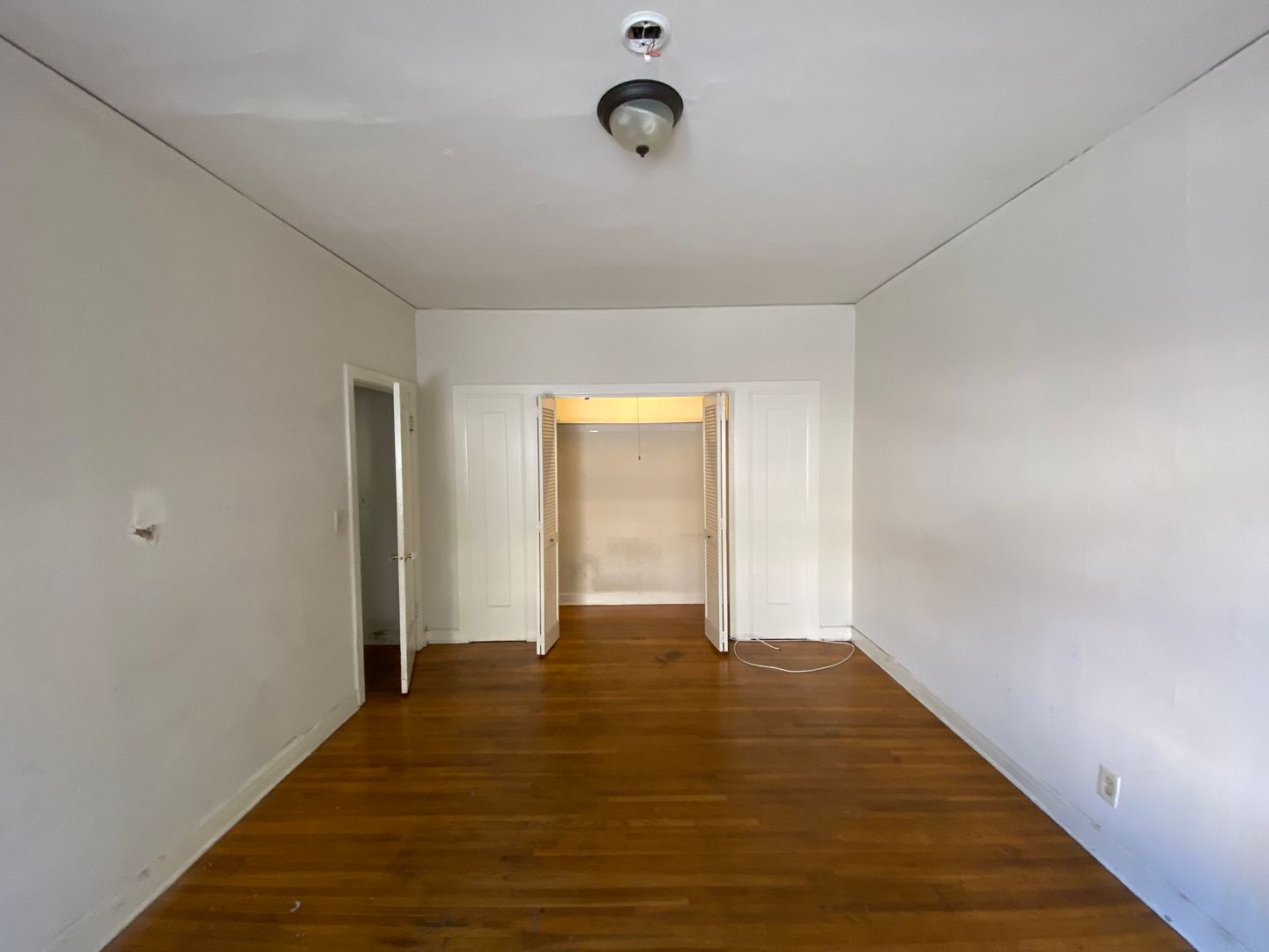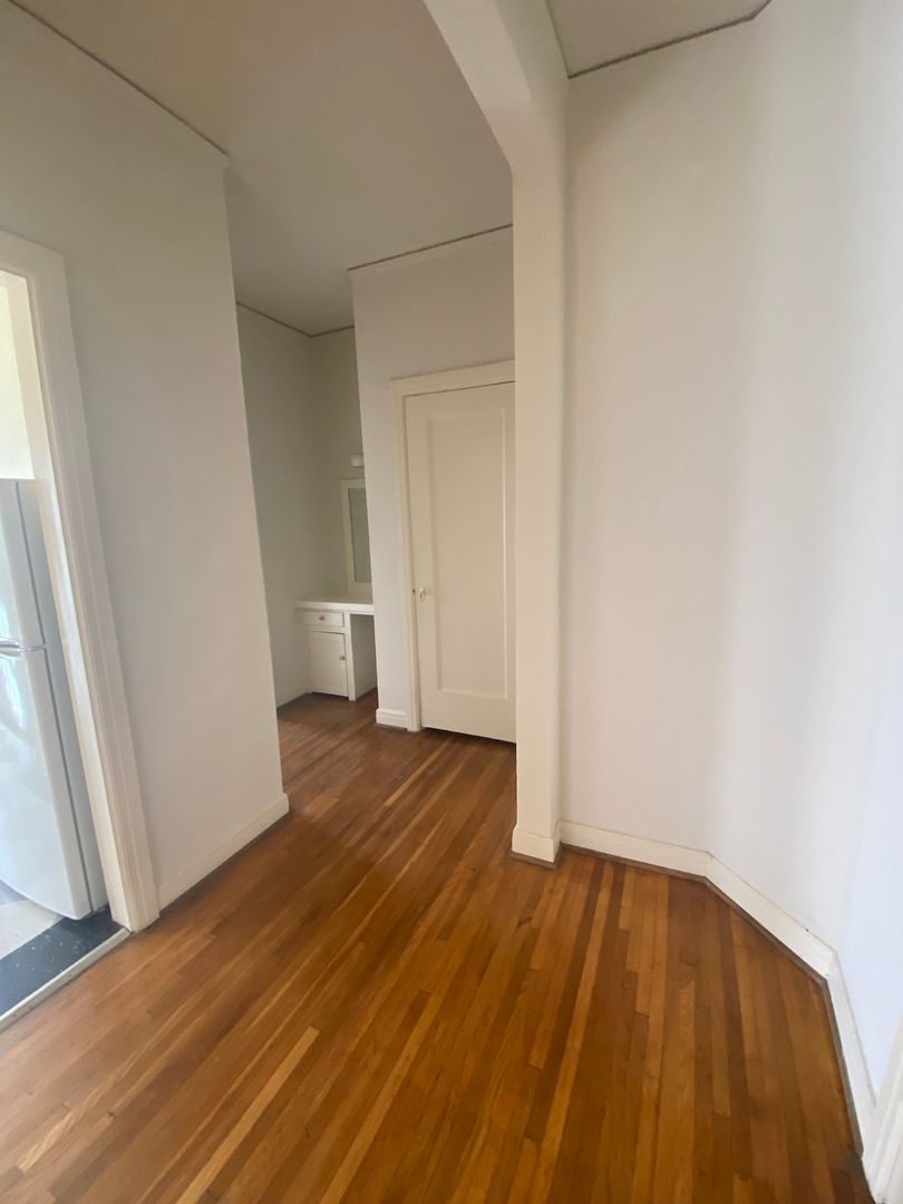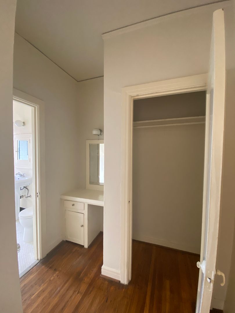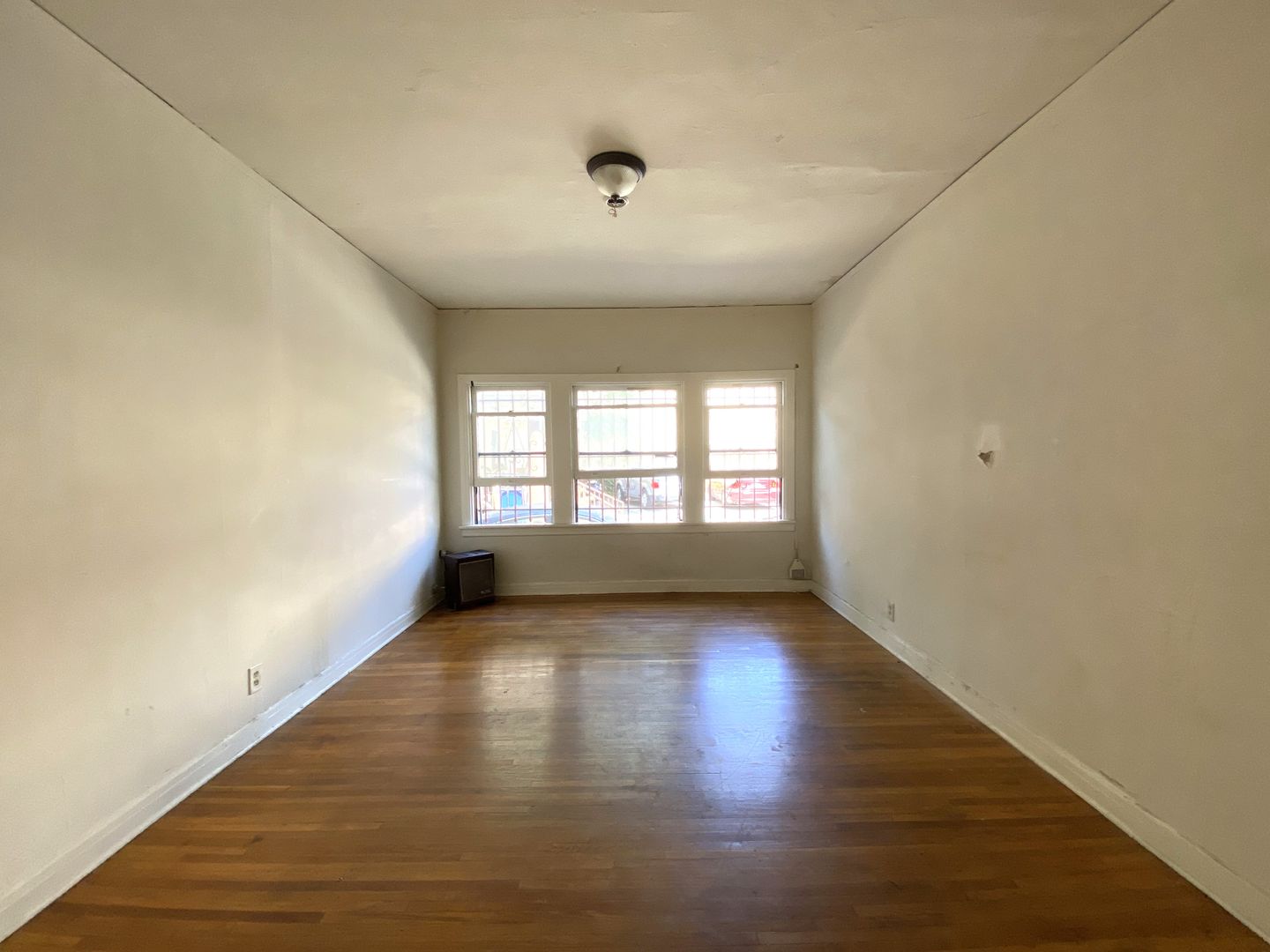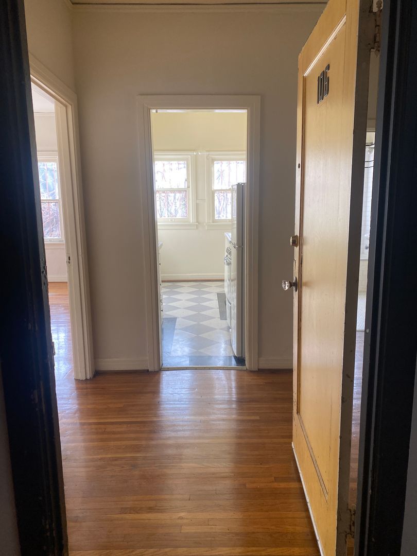 Bright and charming, this unit features hardwood floors, soaring ceilings, and great natural light. The spacious main room is paired with extra-wide hallways, ample closet space, and a built-in vanity. Enjoy a full kitchen with stove and refrigerator, a cozy dining nook, and a large bathroom showcasing its original vintage tile. Gas wall heater in the unit.