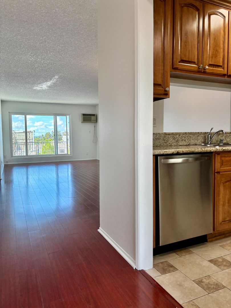 Experience a bright top-floor 1-bedroom, 1-bath apartment in the heart of Beverly Grove featuring skylights and abundant natural light with pleasant views. The building offers a landscaped courtyard garden, a welcoming lobby, intercom access, gated garage parking, and an remodeled on-site laundry room for convenience. Located off 3rd street where you will find coffee shops, restaurants, shops and salons.