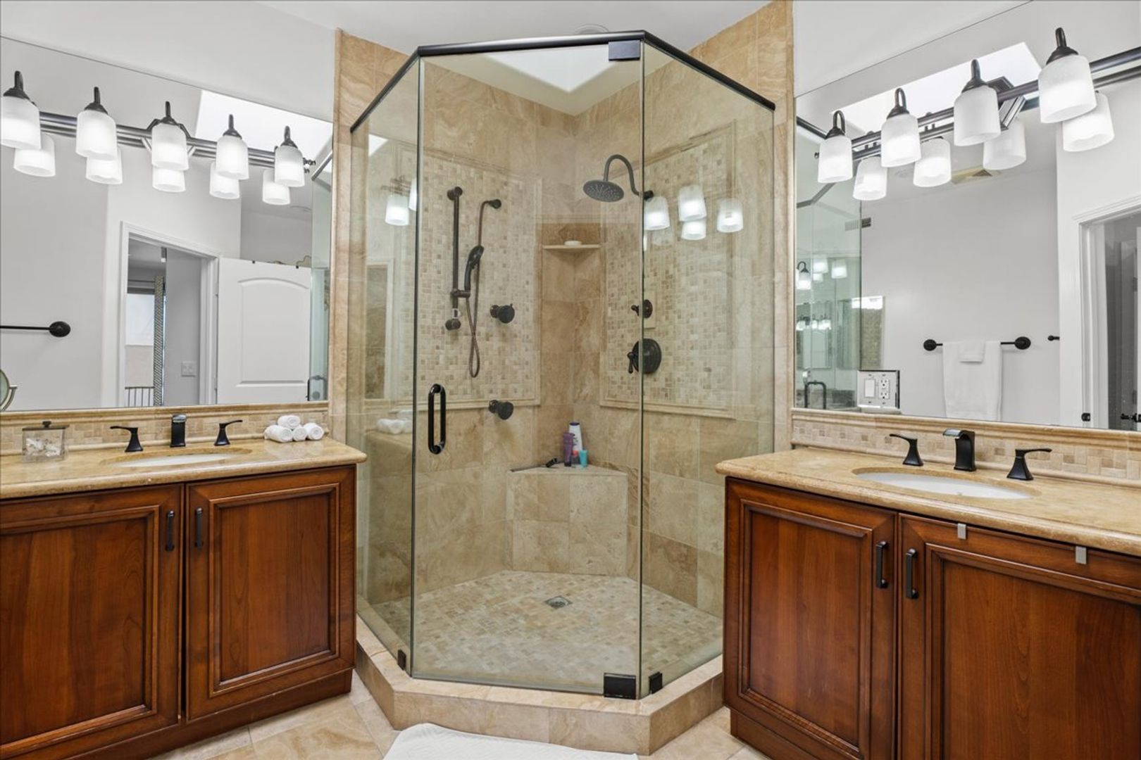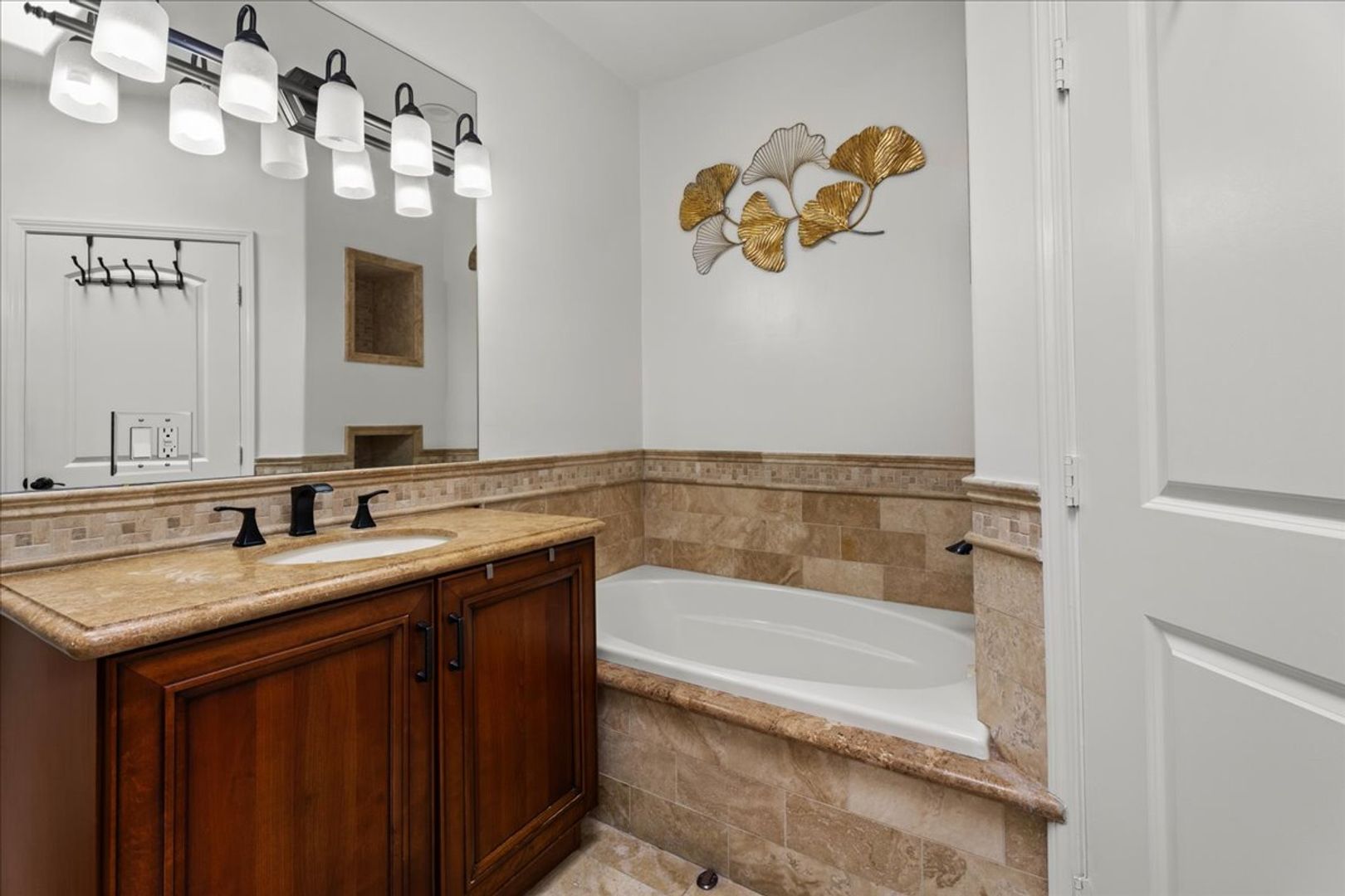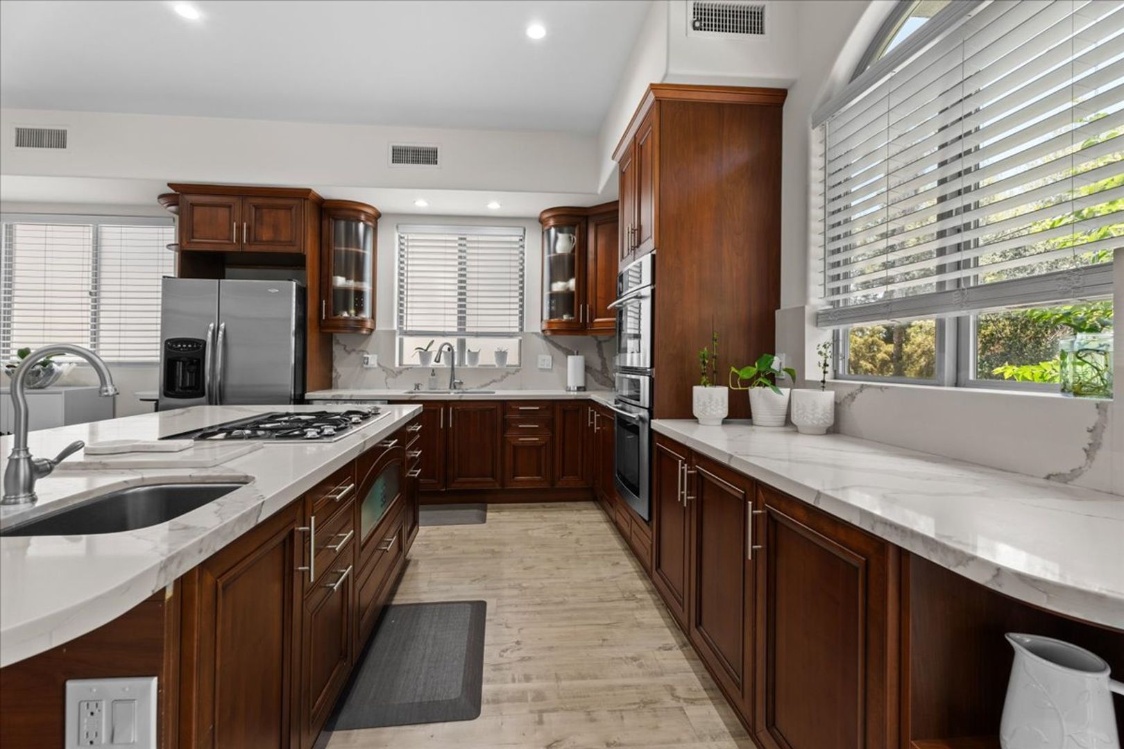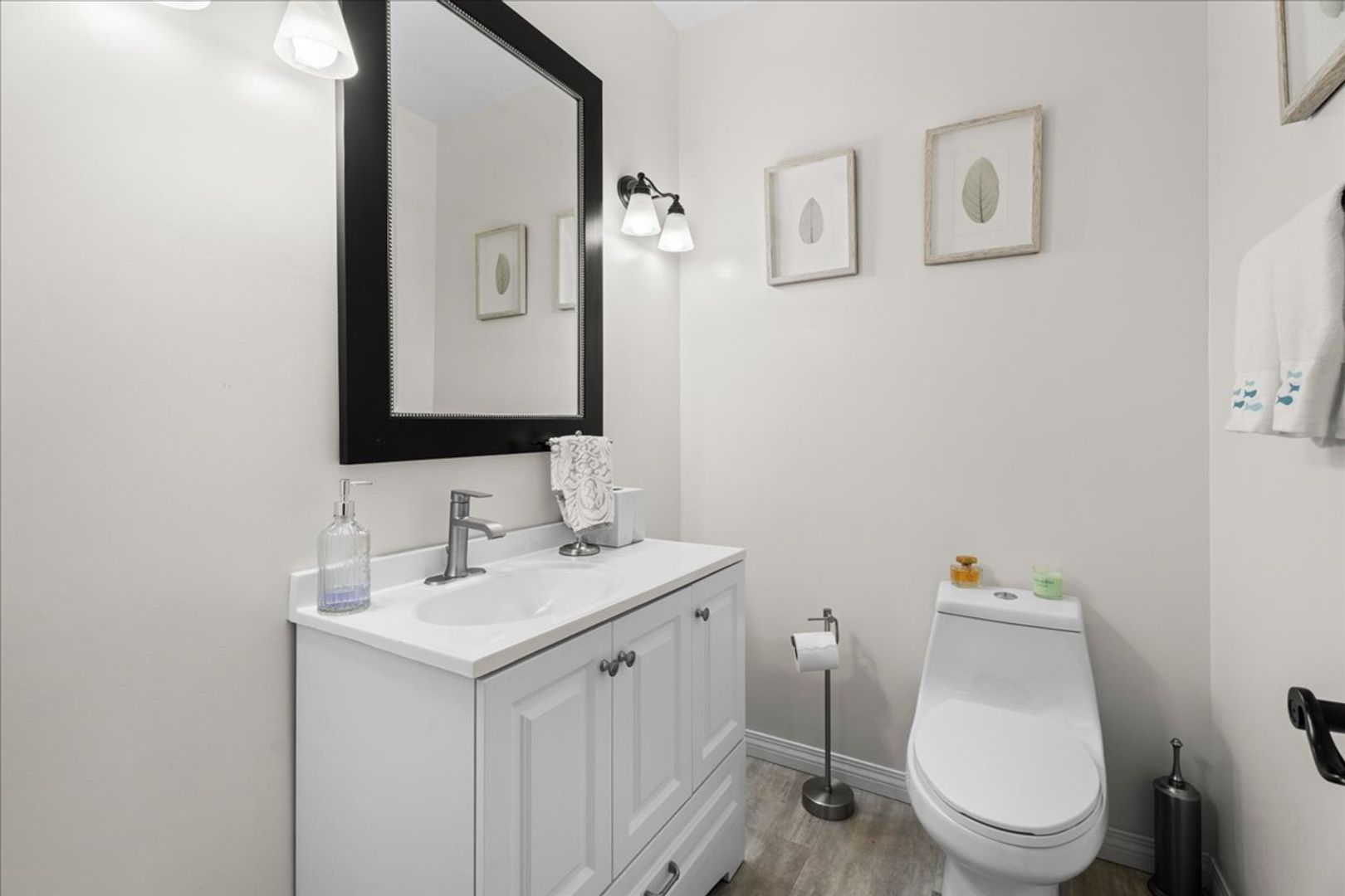 On the main level, the open concept kitchen has luxury warm wood cabinetry, quartz counters, stainless appliances, and a large island with seating. There’s a dining area, a powder bath, and a cozy living room with a gas fireplace. Upstairs, the primary suite has a spacious closet and a large en-suite bath with dual sinks, a walk-in shower, and a separate soaking tub. Two additional bedrooms, another full bath, a laundry closet, and a bonus family area round out the the upstairs.