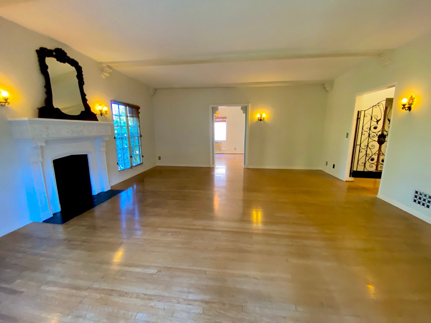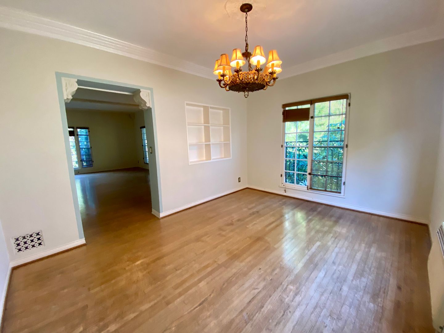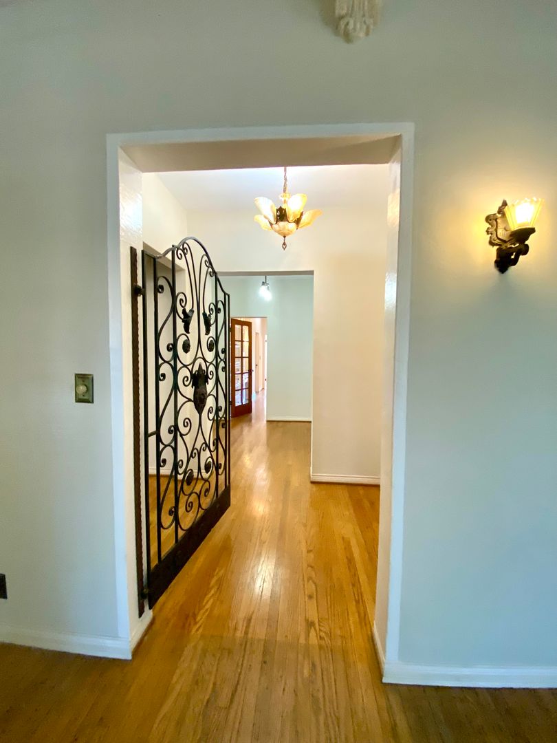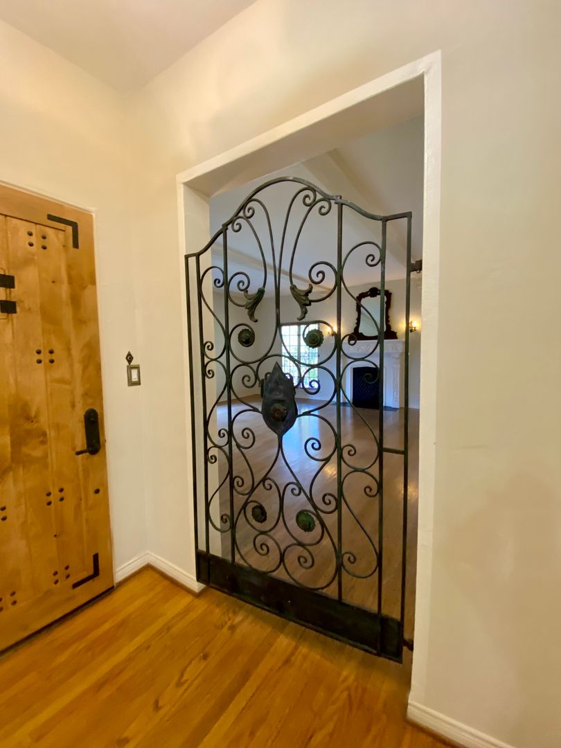 As you approach the courtyard, the property's abundant character shines through—from the striking roofline to the decorative iron that dances across the exterior windows. Step inside and be transported, with original hardwood floors, high ceilings, and a view of the stunning courtyard. Walk into the formal dining room with an elegant chandelier. A spacious living room, fire deco, crown molding, and high wood-beamed ceilings enhance the charm.