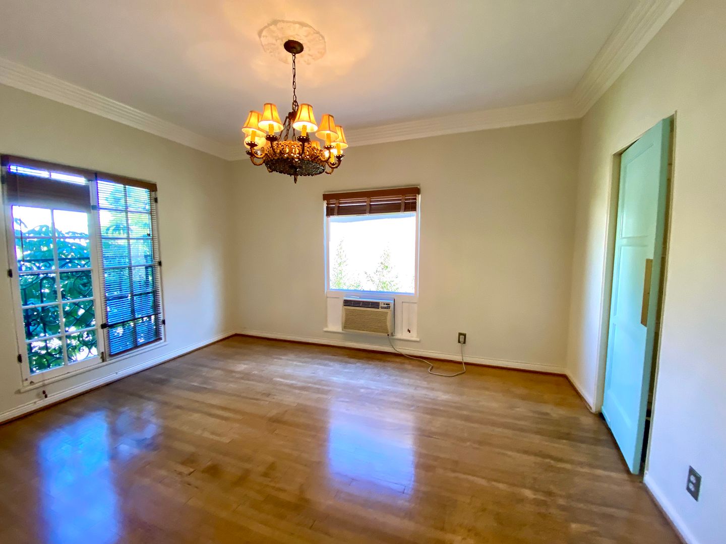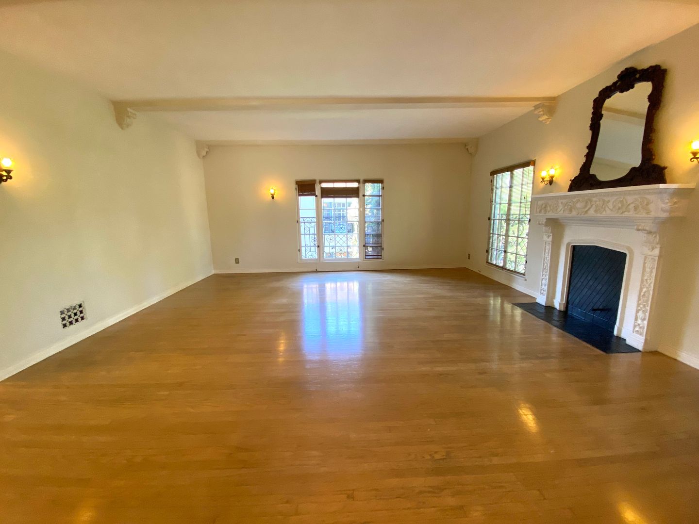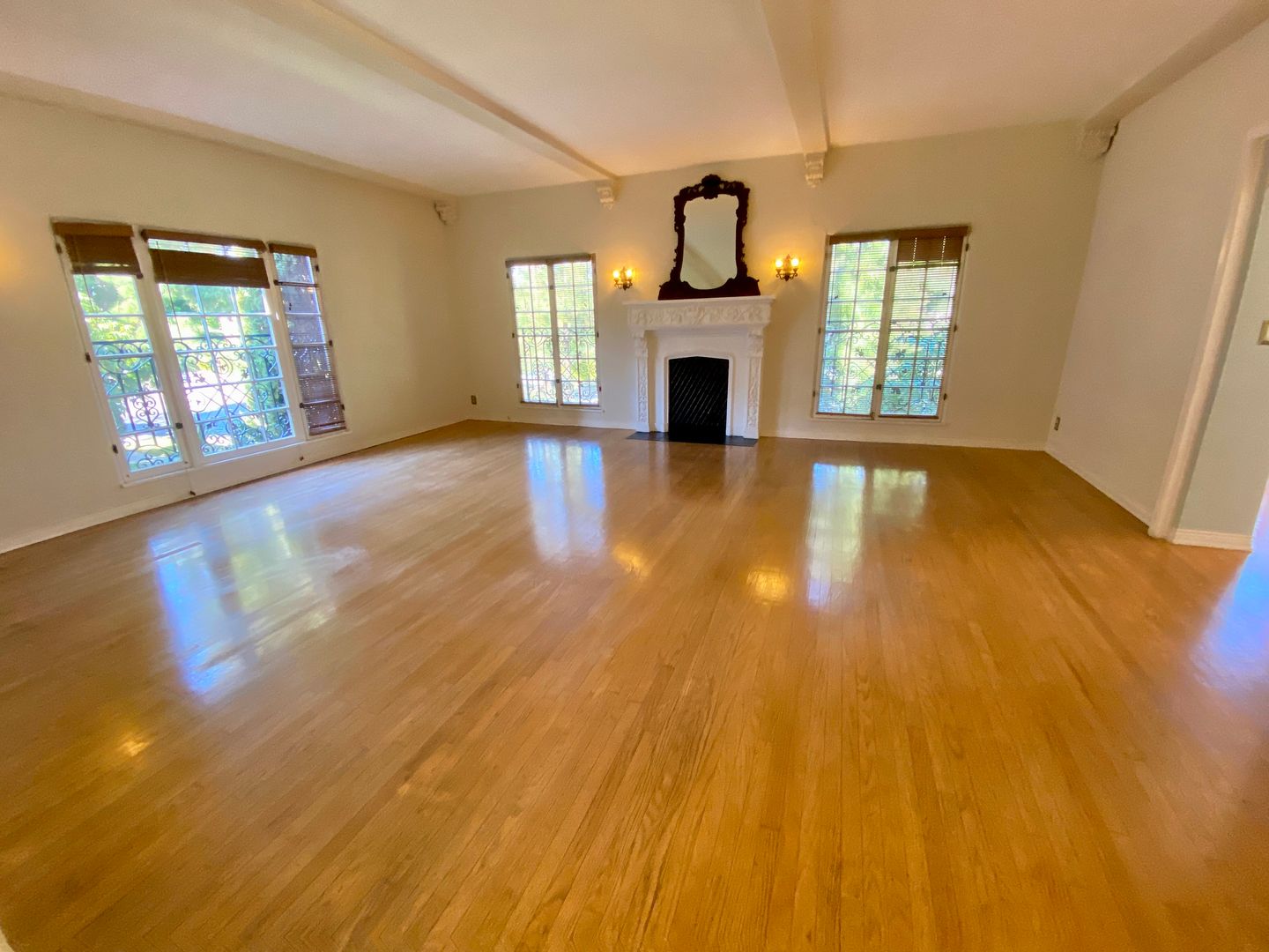 As you approach the courtyard, the property's abundant character shines through—from the striking roofline to the decorative iron that dances across the exterior windows. Step inside and be transported, with original hardwood floors, high ceilings, and a view of the stunning courtyard. Walk into the formal dining room with an elegant chandelier. A spacious living room, fire deco, crown molding, and high wood-beamed ceilings enhance the charm.