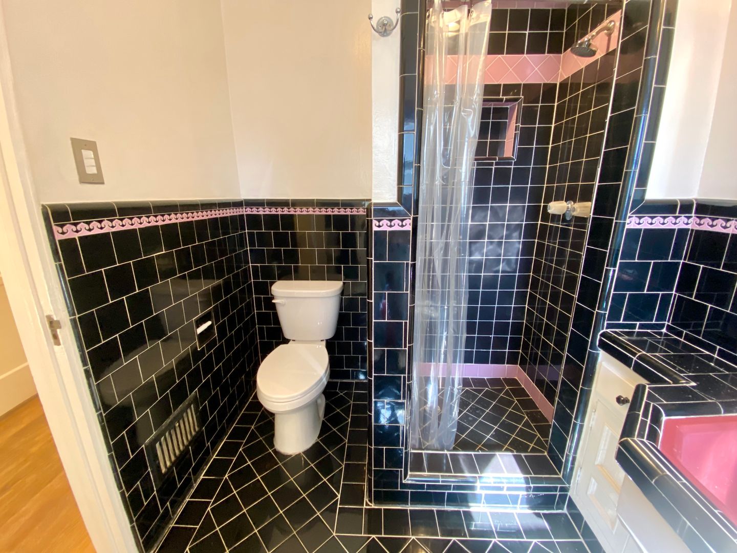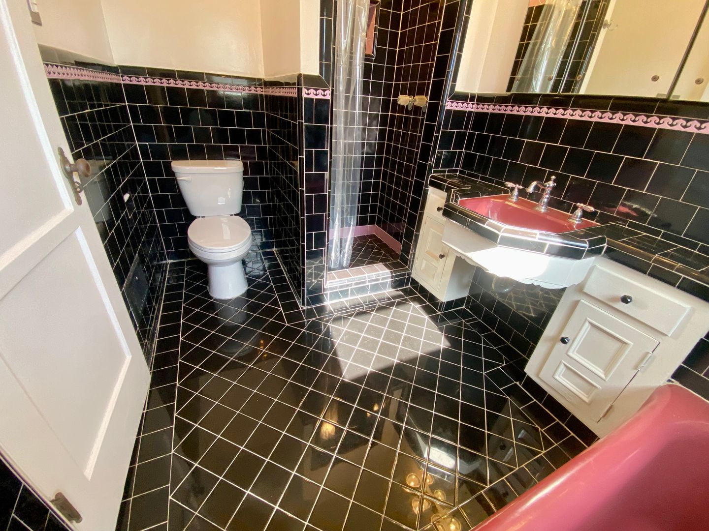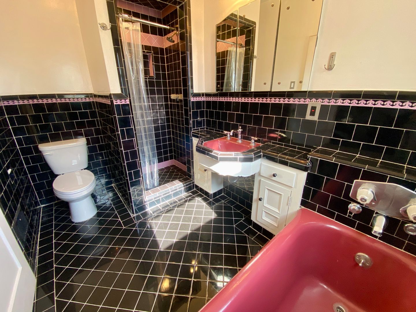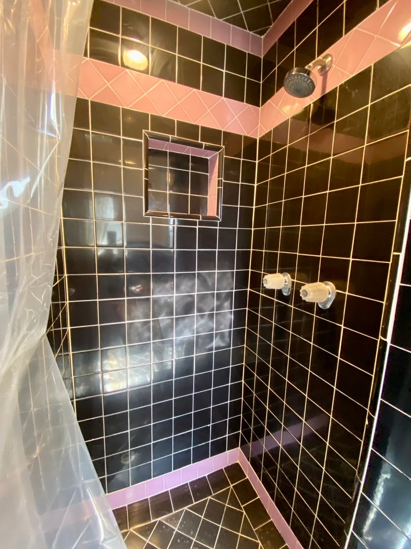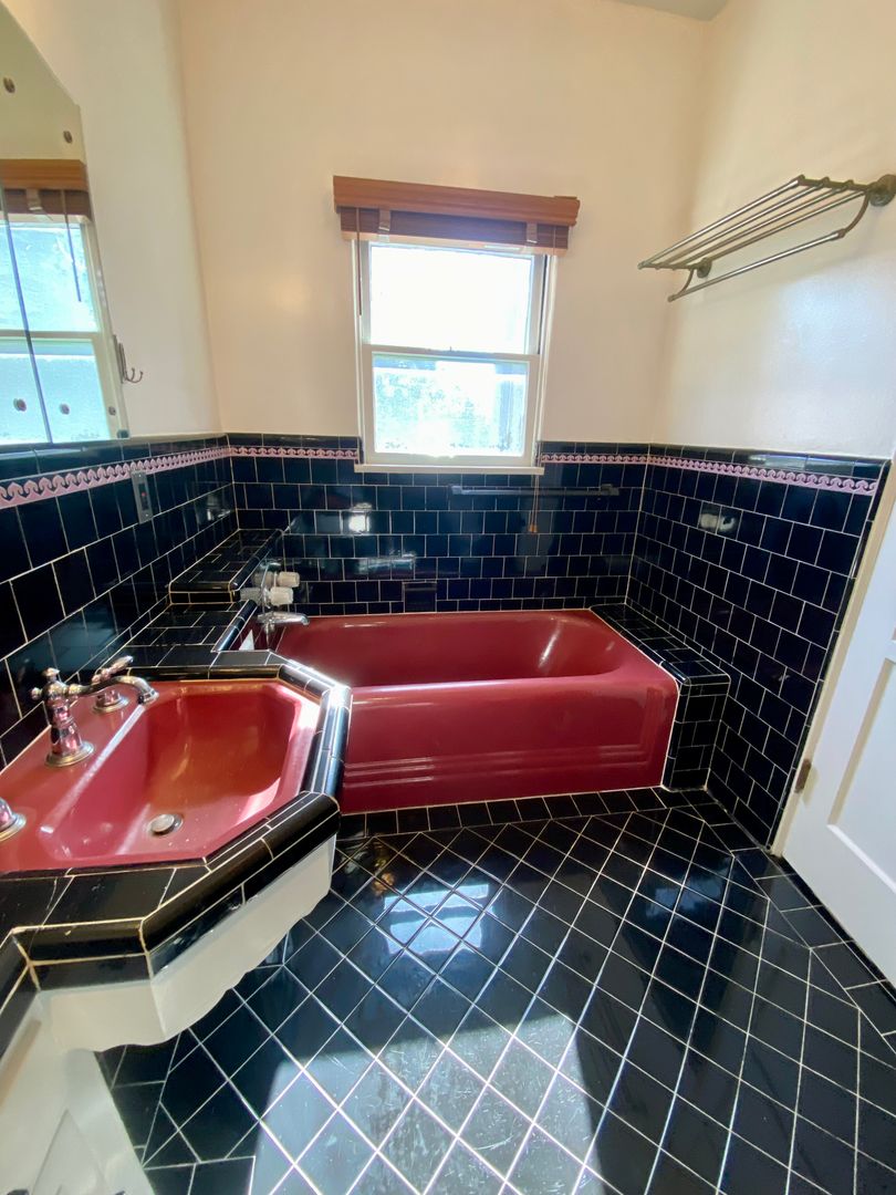 A large bathroom features a separate bathtub and shower stall, covered in its original tiles.